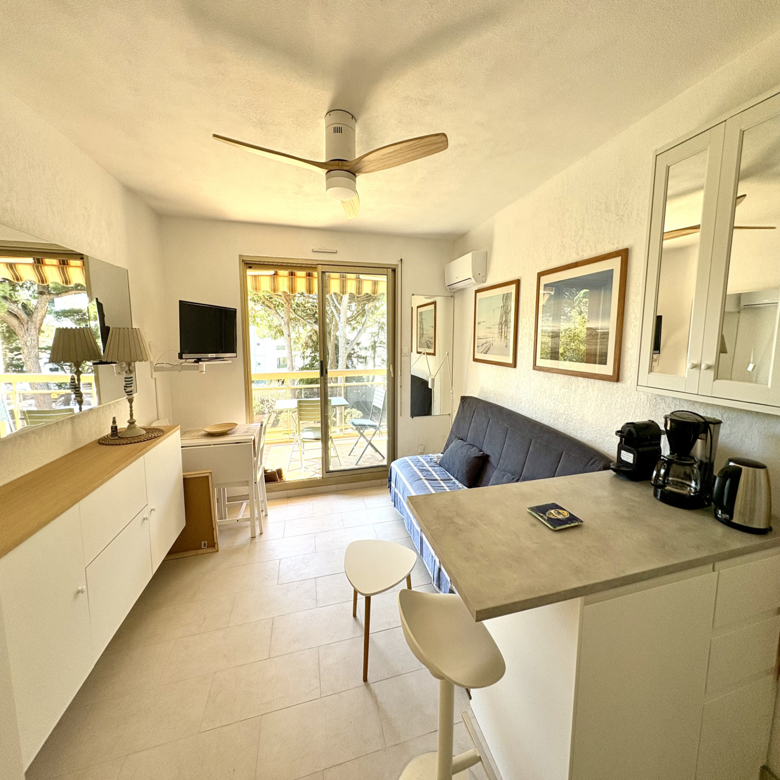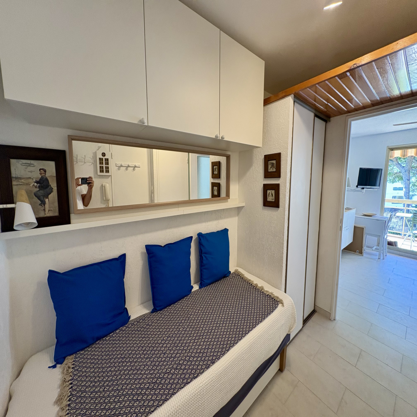 Située dans une residence fermée et recherchée au sein du port de HYERES, l'agence l'échappée bleue vous propose un superbe appartement de type studio cabine entièrement rénové avec gout. Cet appartement situé en étage élevé avec ascenseur, se compose d'une entrée avec coin cabine et rangements, d'une agréable pièce de vie climatisée avec son coin cuisine, une salle de bains et un wc séparé.