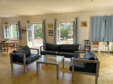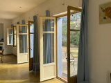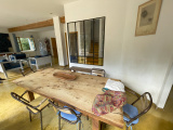 En rez-de-jardin : une entrée, un vaste séjour de 53 m² avec charpente apparente, une cuisine indépendante, un office, WC, une chambre avec salle d’eau et accès terrasse