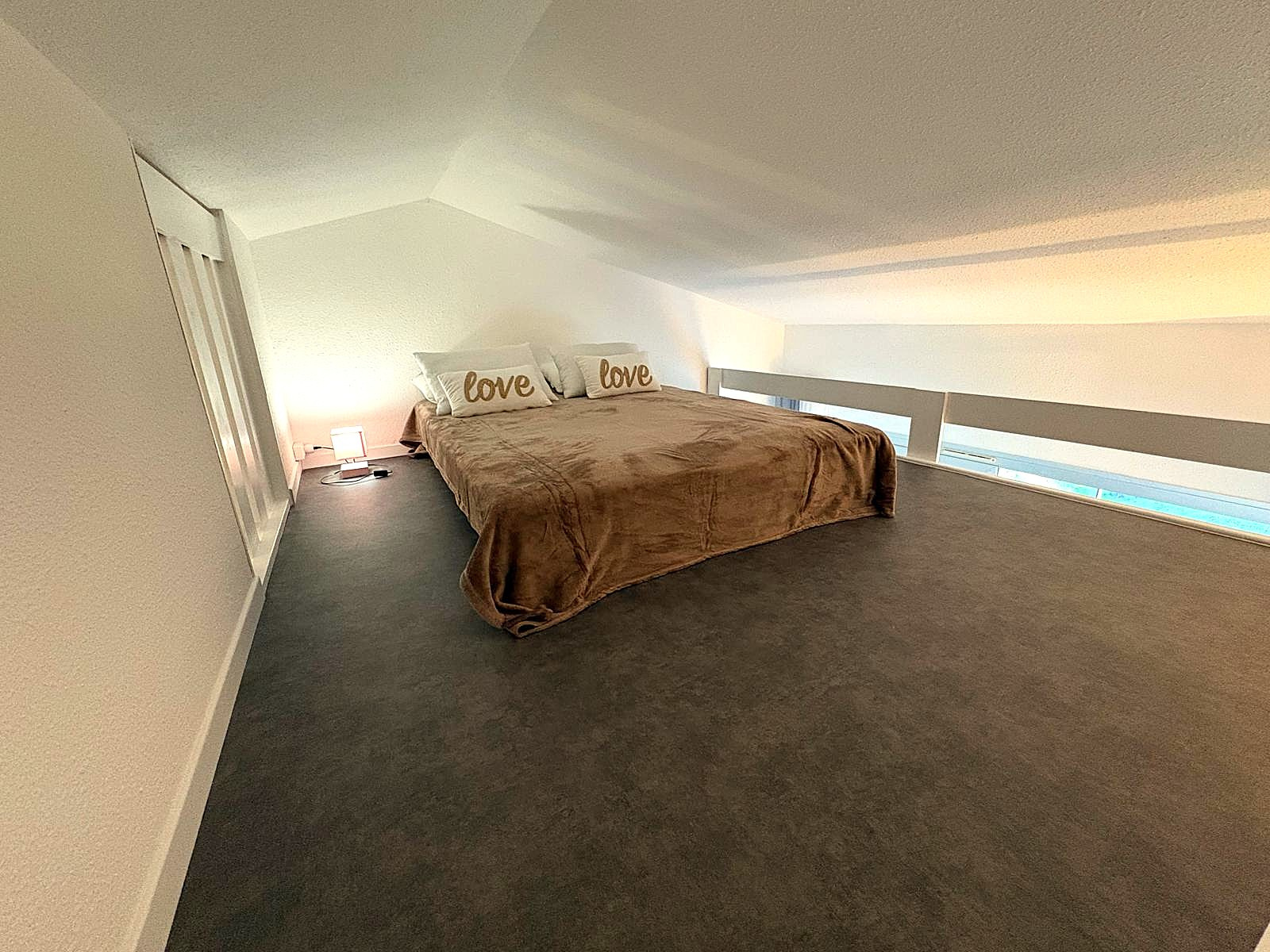 Il est composé d'une pièce de vie avec un coin cuisine aménagé et équipé, une chambre-cabine avec placards, une seconde chambre en mezzanine, une salle d'eau avec douche à l'italienne et wc. Une loggia fermée de 8.2 m² prolonge la pièce de vie.
