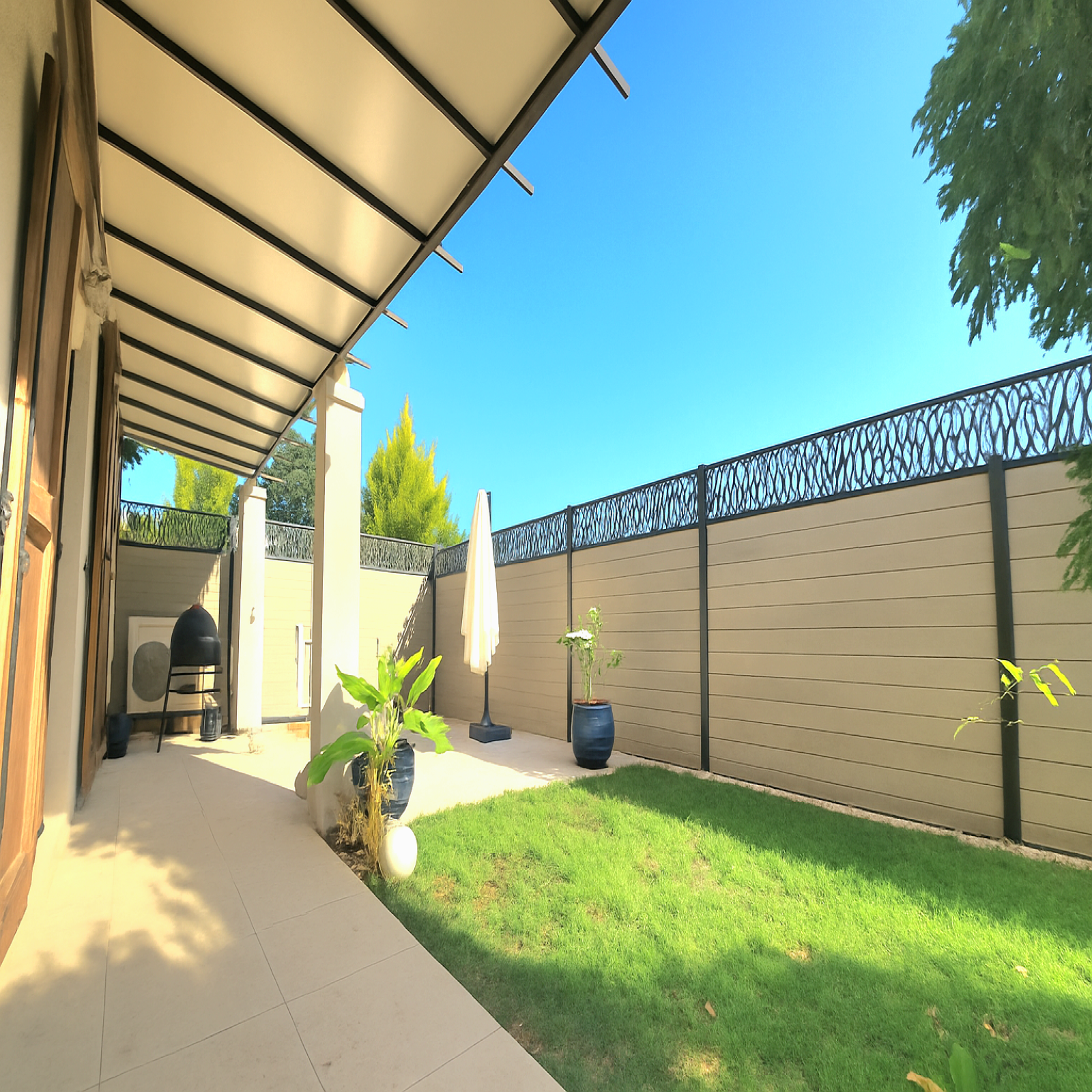Coté extérieur vous profiterez d'un jardin d'environ 100m2 avec terrasse, idéal pour les repas en plein air. Un auvent longeant toute la façade de la maison offre un espace abrité appréciable.