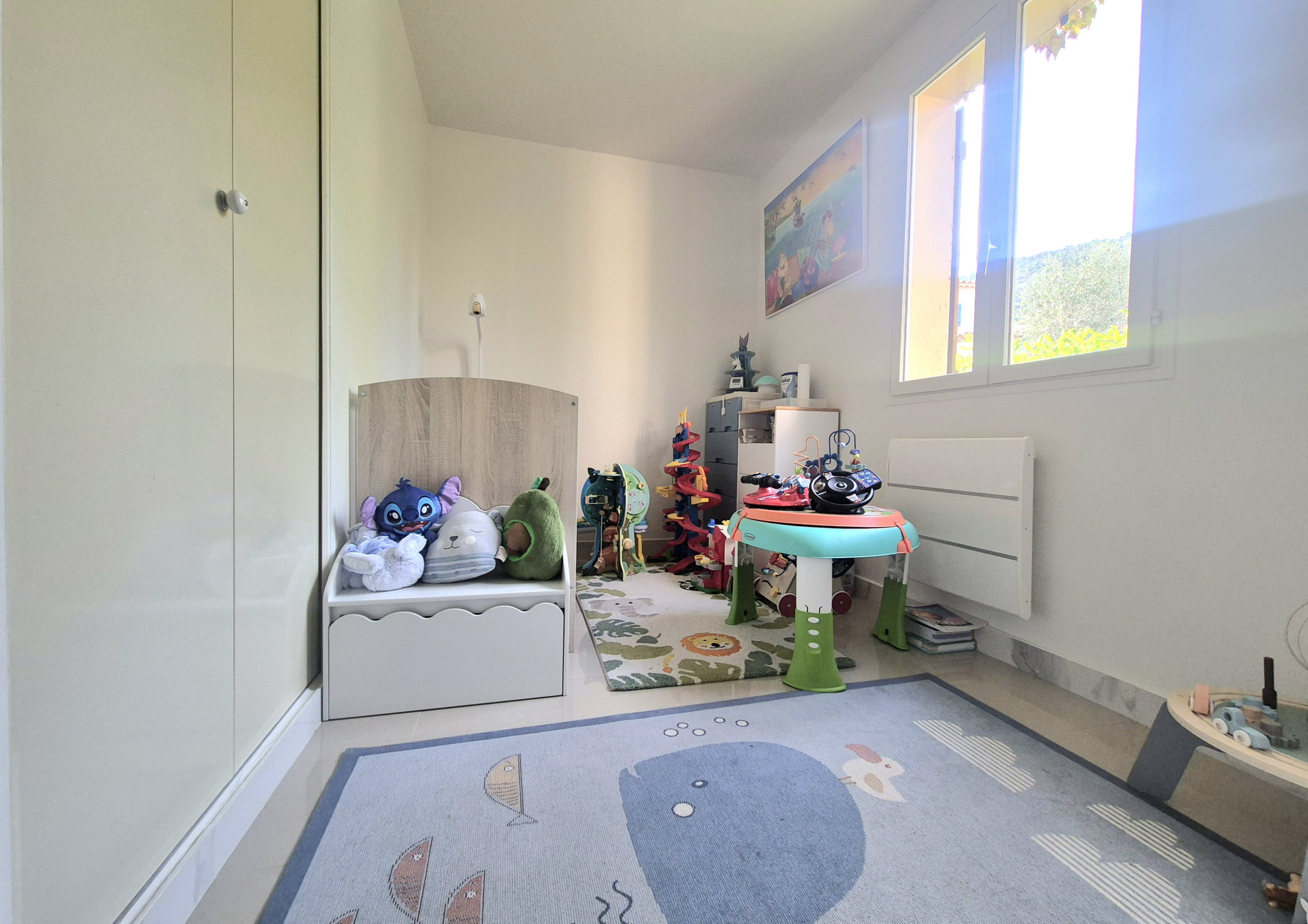 La maison se compose d'une entrée, d'un séjour lumineux, climatisé, exposé Sud-Est, avec une cuisine ouverte aménagée et équipée, de 3 chambres avec rangements intégrés dont une chambre parentale avec accès direct au jardin. Et enfin une salle de bain fonctionnelle avec douche, baignoire, et WC.