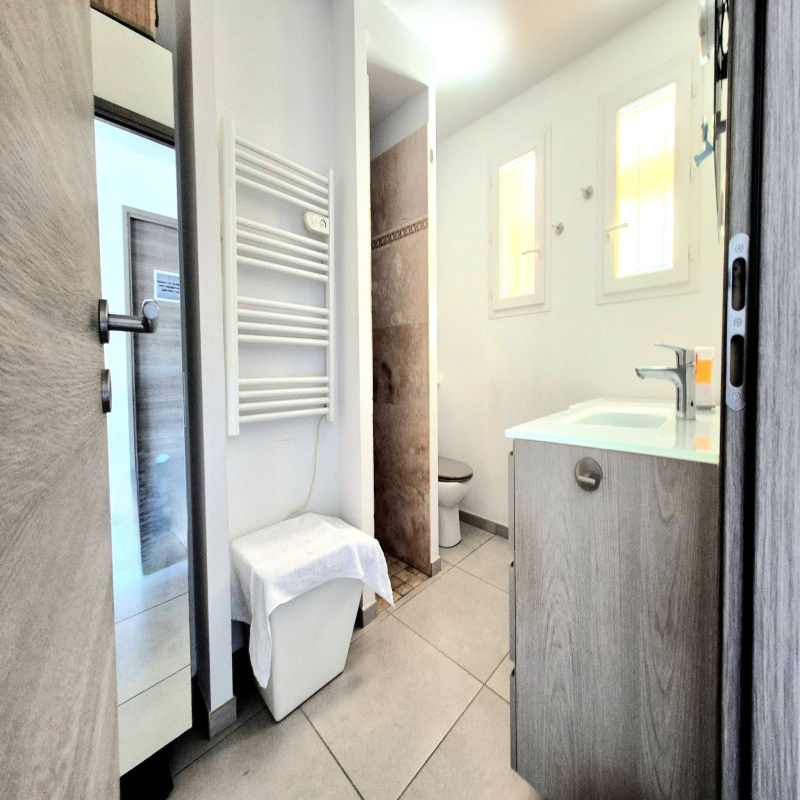 Le studio, situé sur le même palier, est d'une superficie d'environ 19 m². Exposé Nord il se compose d'un séjour avec kitchenette et d'une salle d'eau avec WC. Il est actuellement loué 450 €/mois.