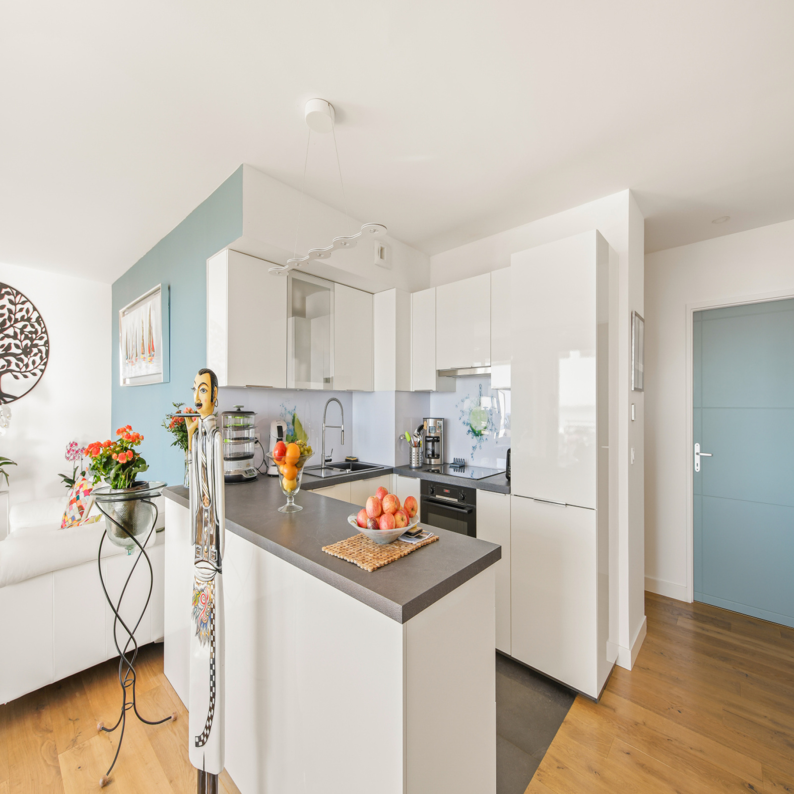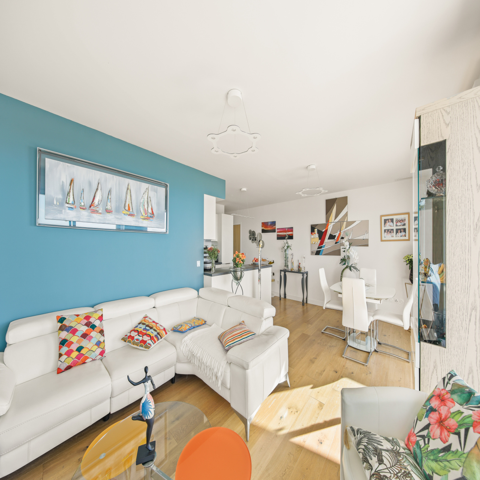 Dès l’entrée, le ton est donné. L’espace de 75 m² s’ouvre avec fluidité : une cuisine moderne, discrètement intégrée, se fond dans un vaste séjour baigné de lumière. Les larges baies vitrées laissent entrer le soleil du Sud, jouant sur les volumes avec élégance et chaleur. La salle à manger et le salon forment un espace de vie harmonieux, conçu pour le confort autant que pour la contemplation.