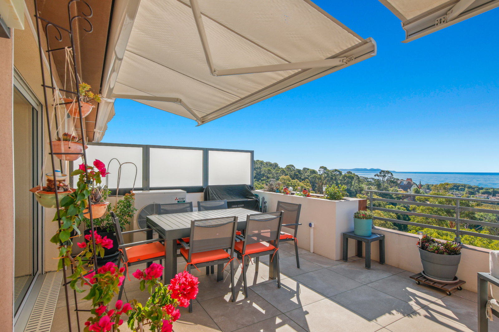 À l’extérieur, la magie continue : une large terrasse prolonge l’espace de vie. Orientée plein sud, elle est protégée à l’est et à l’ouest par des vitres teintées, préservant l’intimité tout en laissant intacte la vue majestueuse. Deux stores bannes électriques permettent d’apprivoiser le soleil, pour des moments de détente à toute heure.