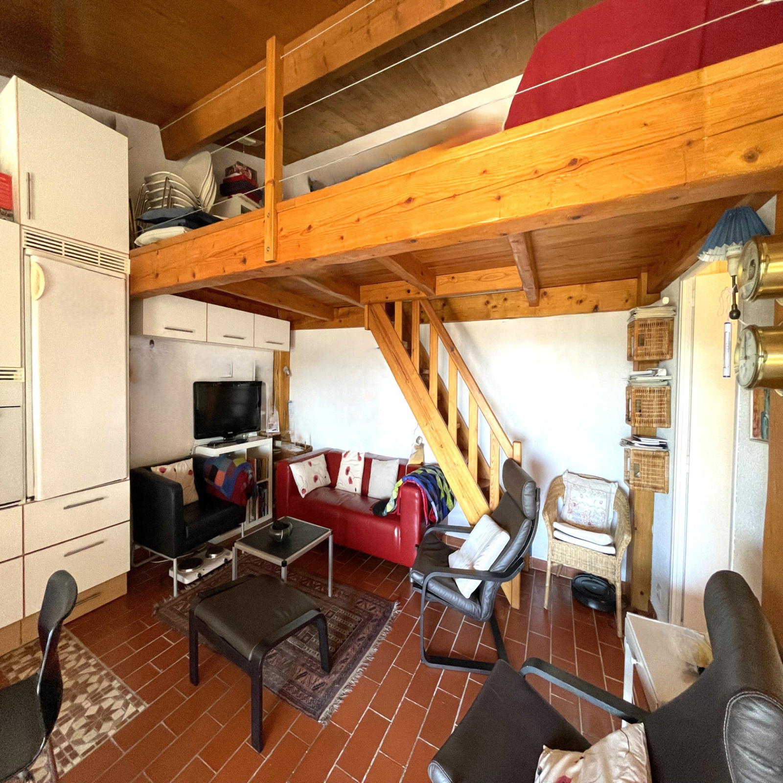 À l’intérieur, l’espace a été optimisé avec goût : une pièce de vie conviviale avec cuisine ouverte, sublimée par une mezzanine offrant un espace de couchage cosy. Un couloir avec rangements dessert une chambre lumineuse orientée plein sud ainsi qu’une salle d’eau avec WC. L’ensemble s’ouvre harmonieusement sur la terrasse et le jardin qui la prolonge.