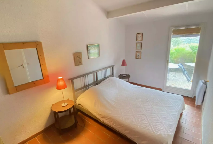 La maison propose deux chambres, dont l’une s’ouvre directement sur la terrasse, prolongeant ainsi les espaces vers l’extérieur. Une salle de bains et des toilettes séparées complètent l’agencement avec praticité.