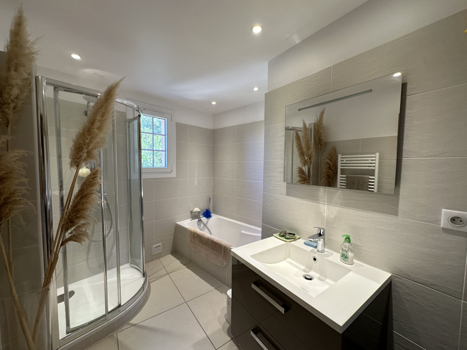 Une maison spacieuse et lumineuse, entièrement rénovée, conçue pour un confort optimal, avec des espaces de vie ouverts sur l'extérieur et un jardin aménagé accessible.