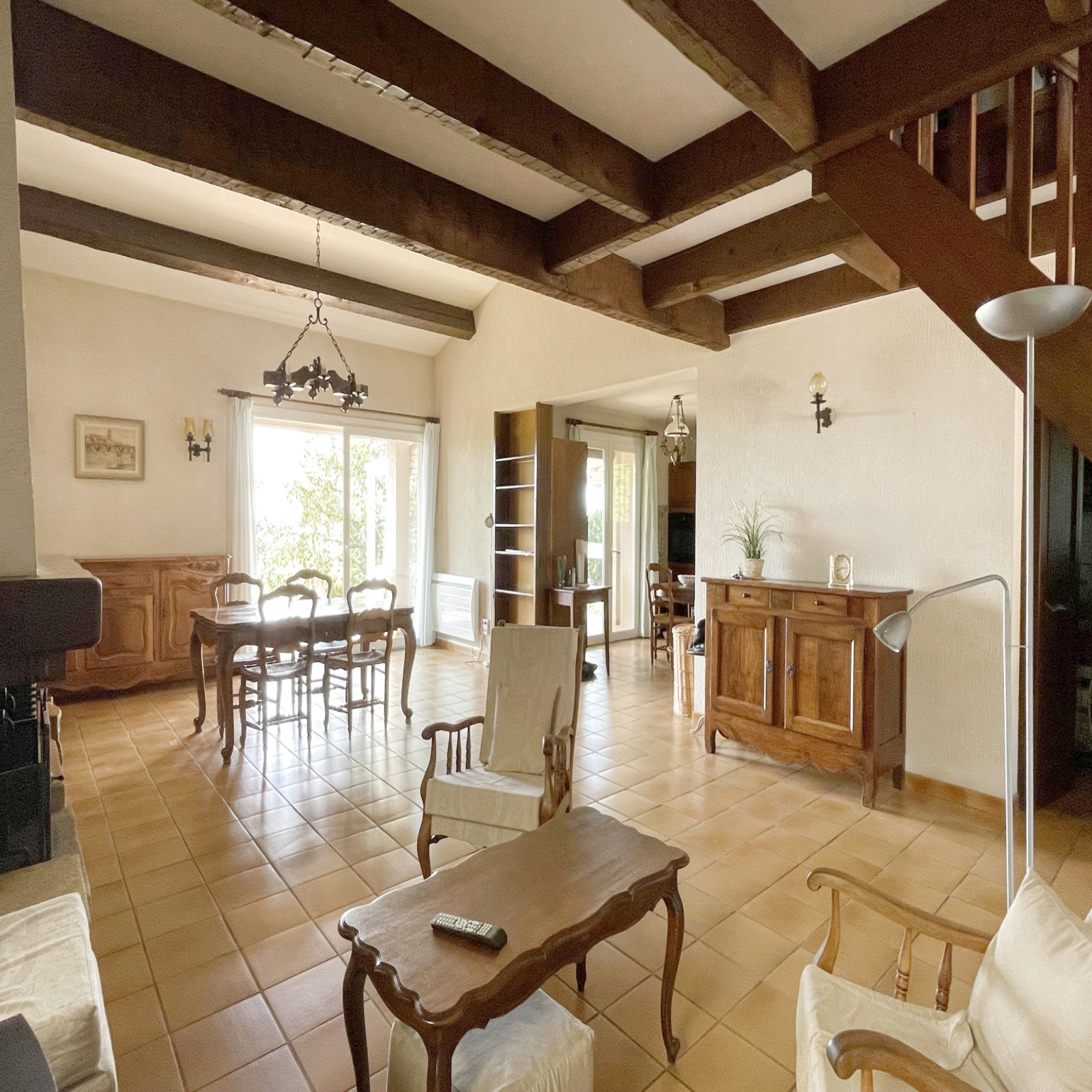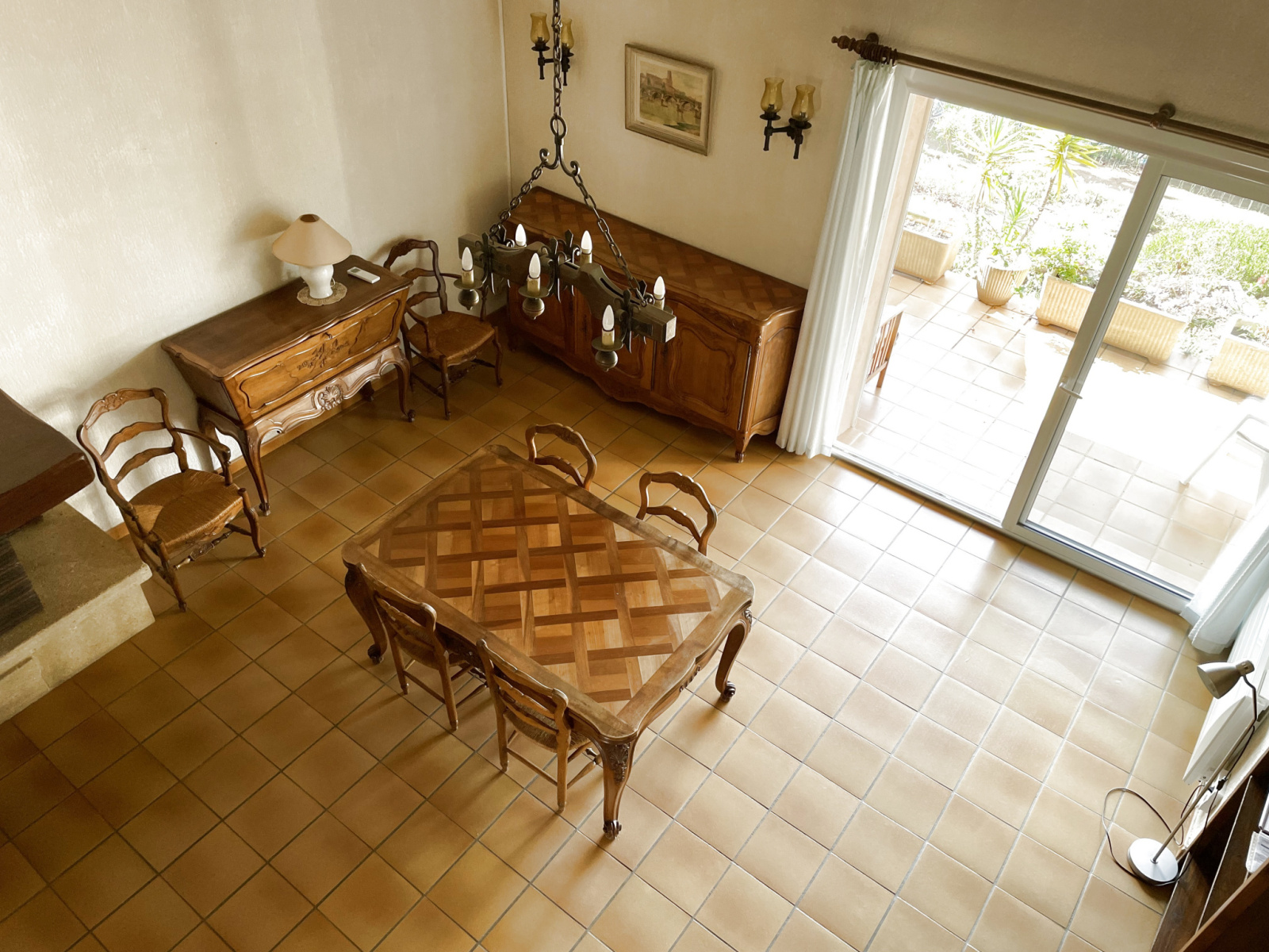 À l’intérieur, c’est vaste et clair. On entre par un grand vestibule, on passe dans un salon avec cheminée — un vrai feu, et puis une salle à manger baignée de lumière, qui s’ouvre sur la terrasse où le panorama vous attend.