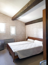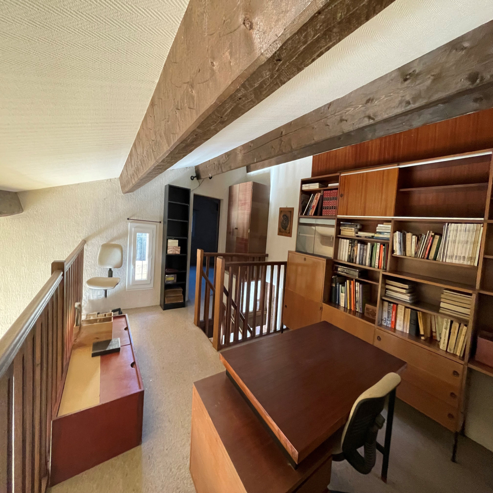 En haut, dans la mezzanine, un bureau et une chambre mansardée.