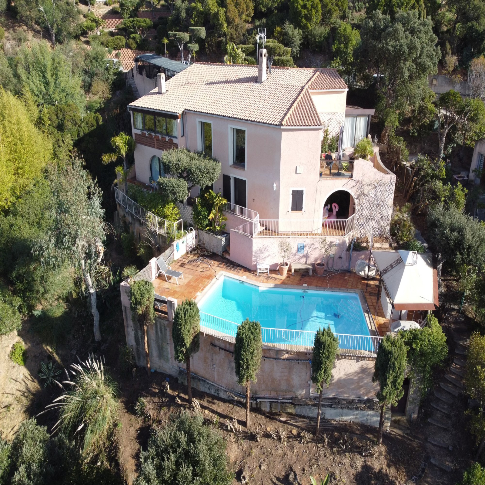 Elle comprend, au Niveau principal : une Belle entrée ouvrant sur un vaste séjour de 44 m² donnant sur une terrasse de 18 m² avec vue panoramique. Une cuisine provençale entièrement équipée avec buanderie + grands celliers attenants. Enfin elle ouvre sur une terrasse fermée par baies coulissantes avec barbecue intégré. Sur ce niveau également une suite parentale avec double dressing, salle d’eau et toilettes séparées.