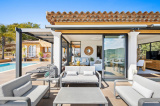 Côté extérieur, la terrasse plein sud prolonge les espaces de vie jusqu’à la piscine traditionnelle, idéale pour savourer les longues journées d’été.