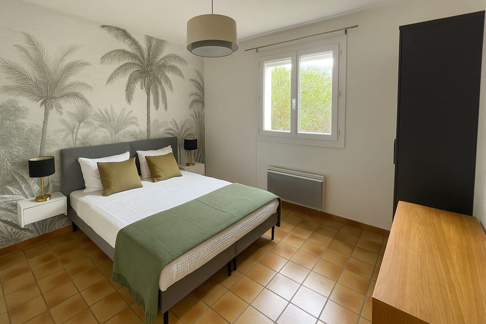 À l’étage, la mezzanine accueille un bureau et une chambre mansardée.