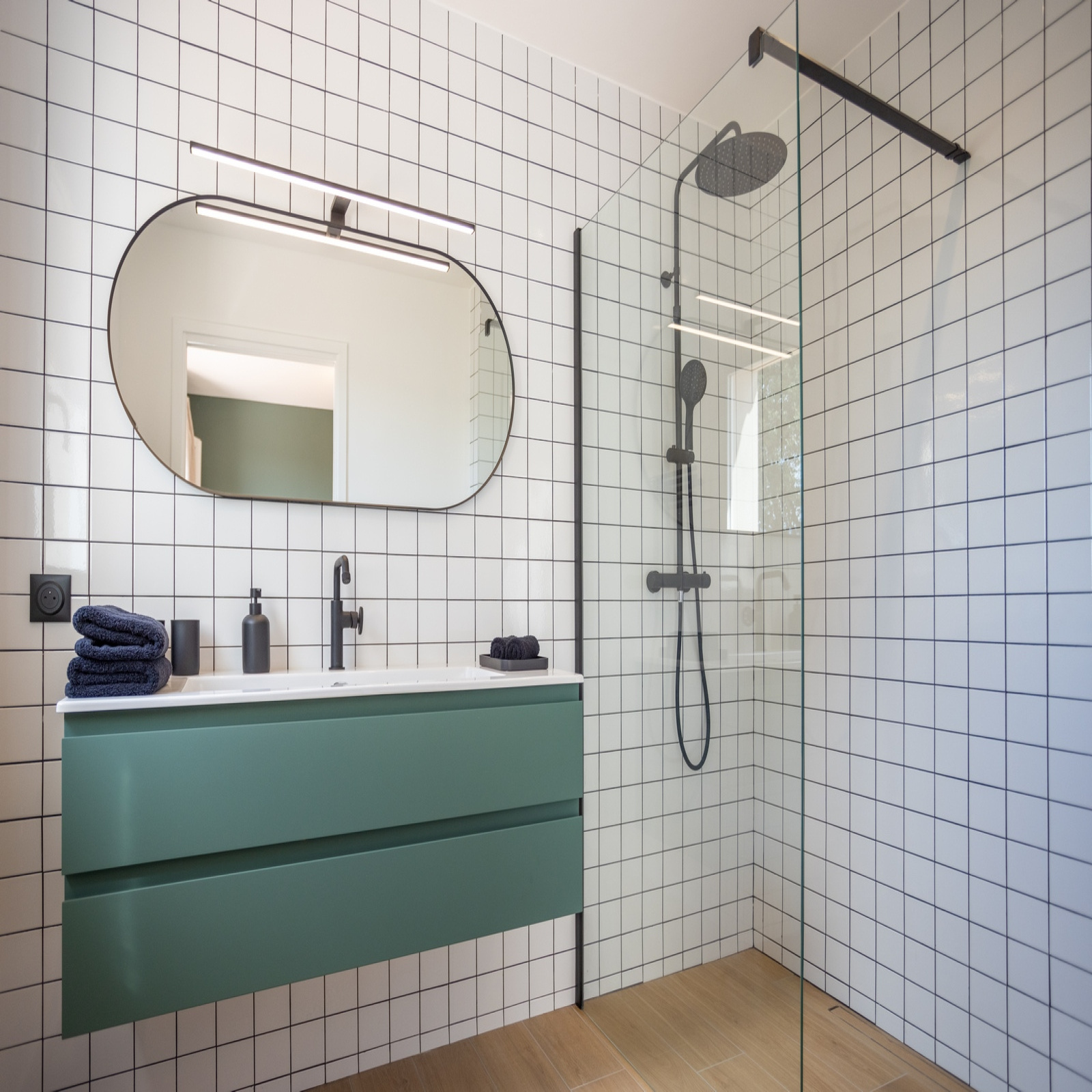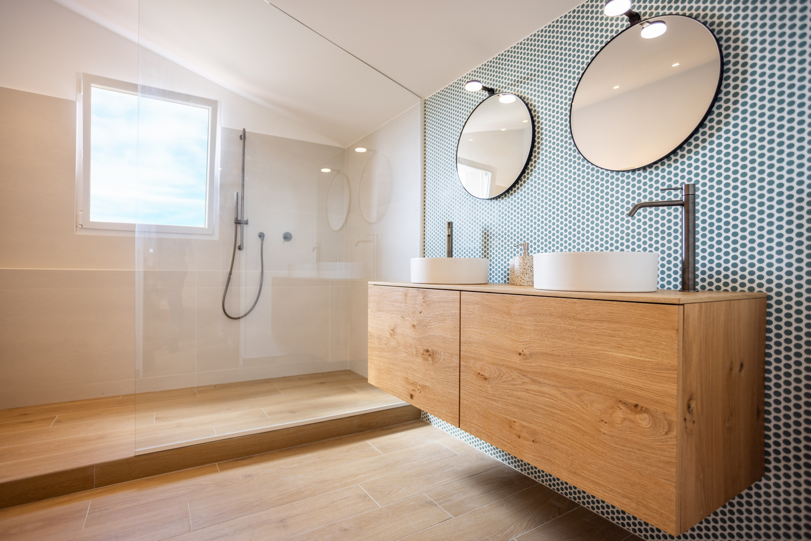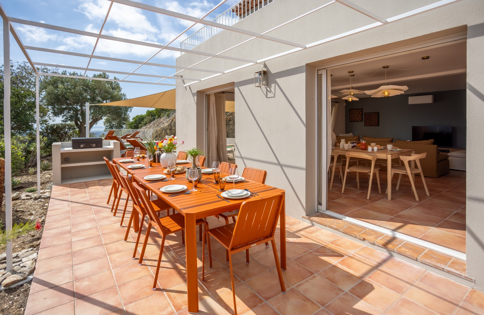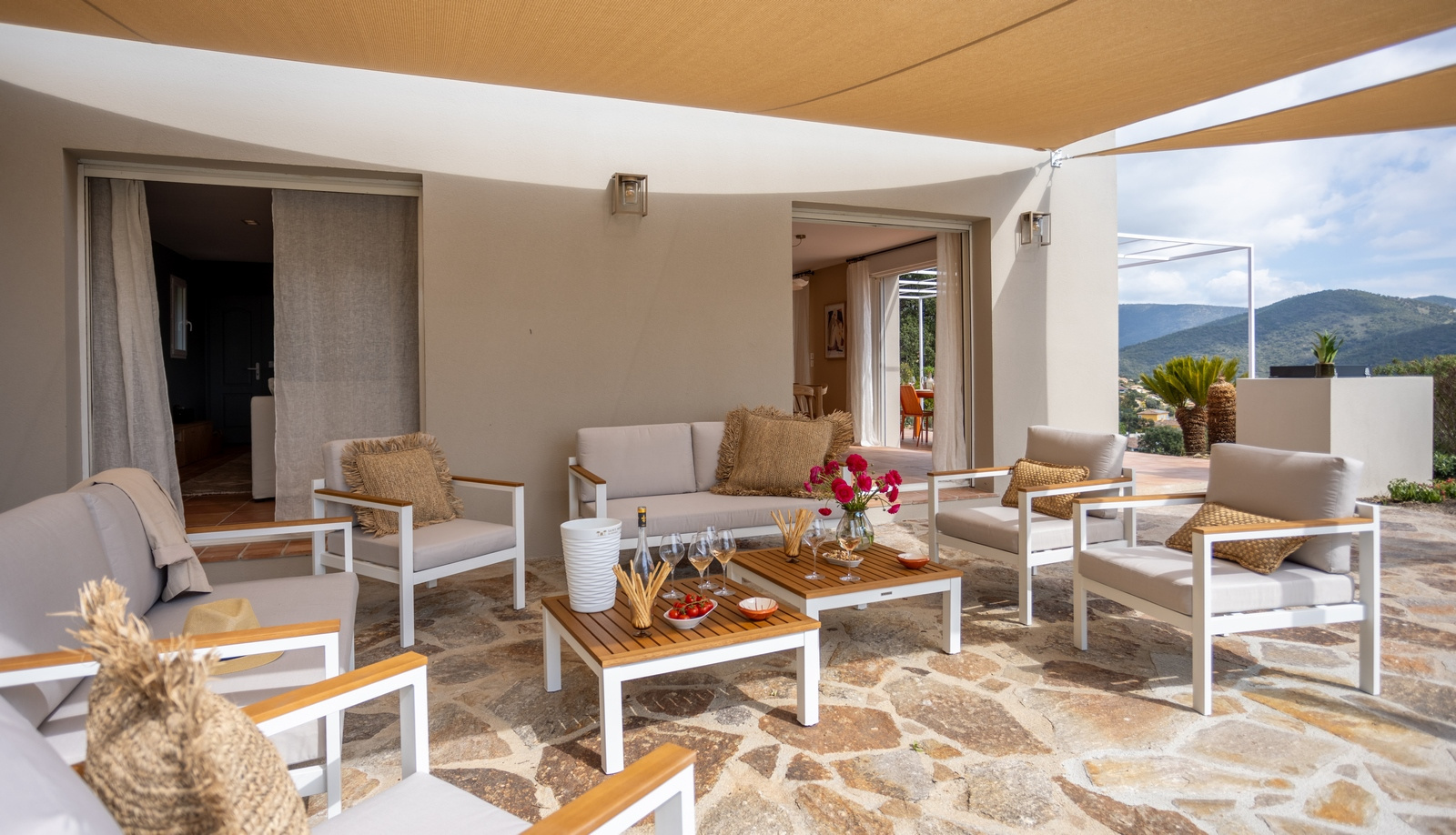 À l’extérieur, la maison déploie ses espaces de vie : Au sud, des toiles d’ombrage et une piscine carrelée de mosaïques, tournée vers la mer, prolongée par une élégante terrasse en bois.