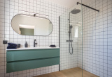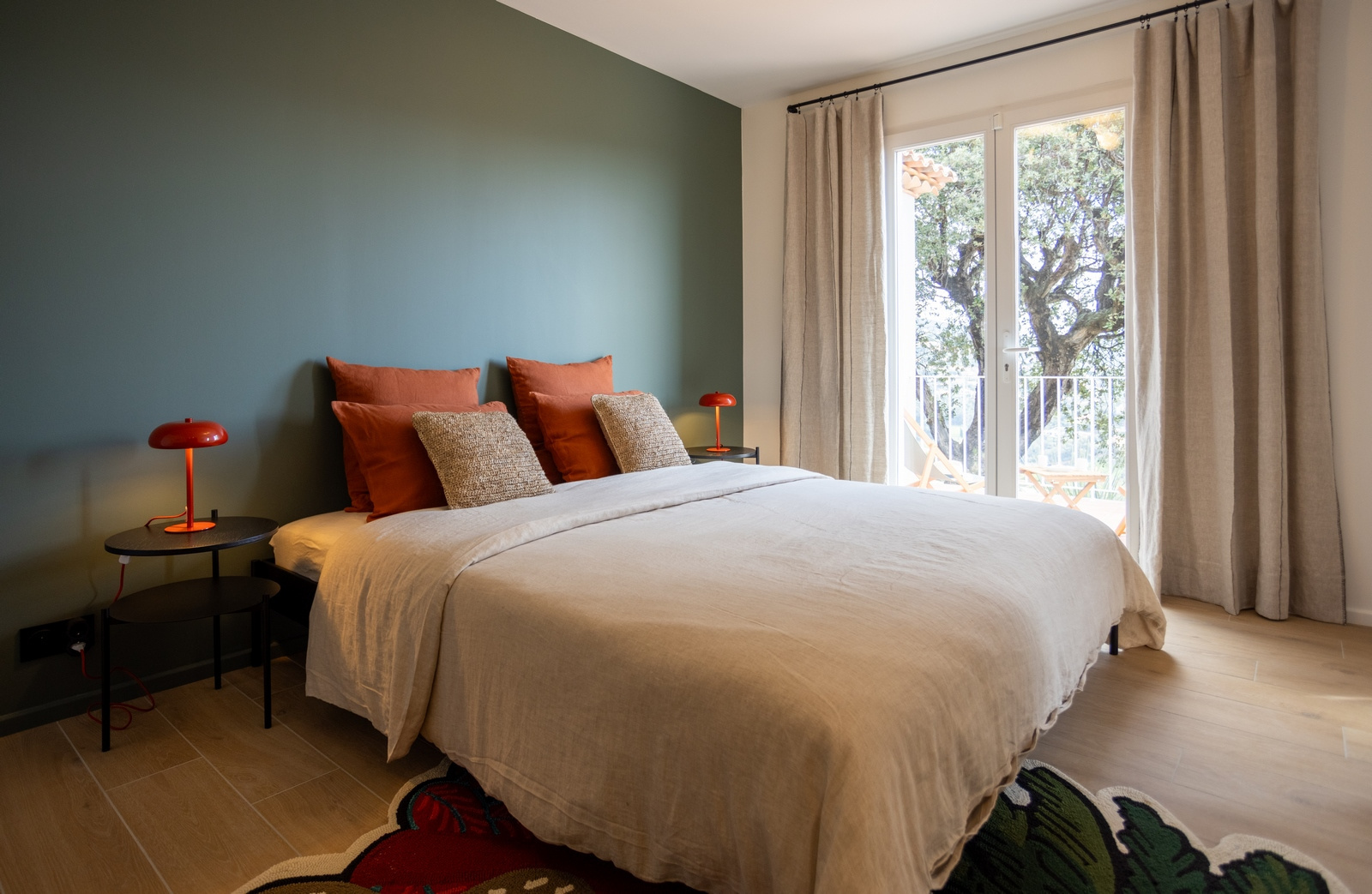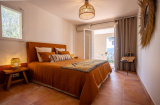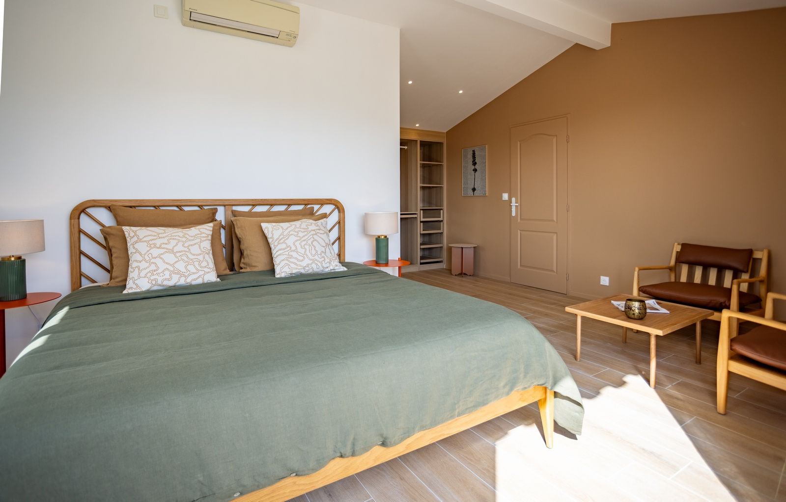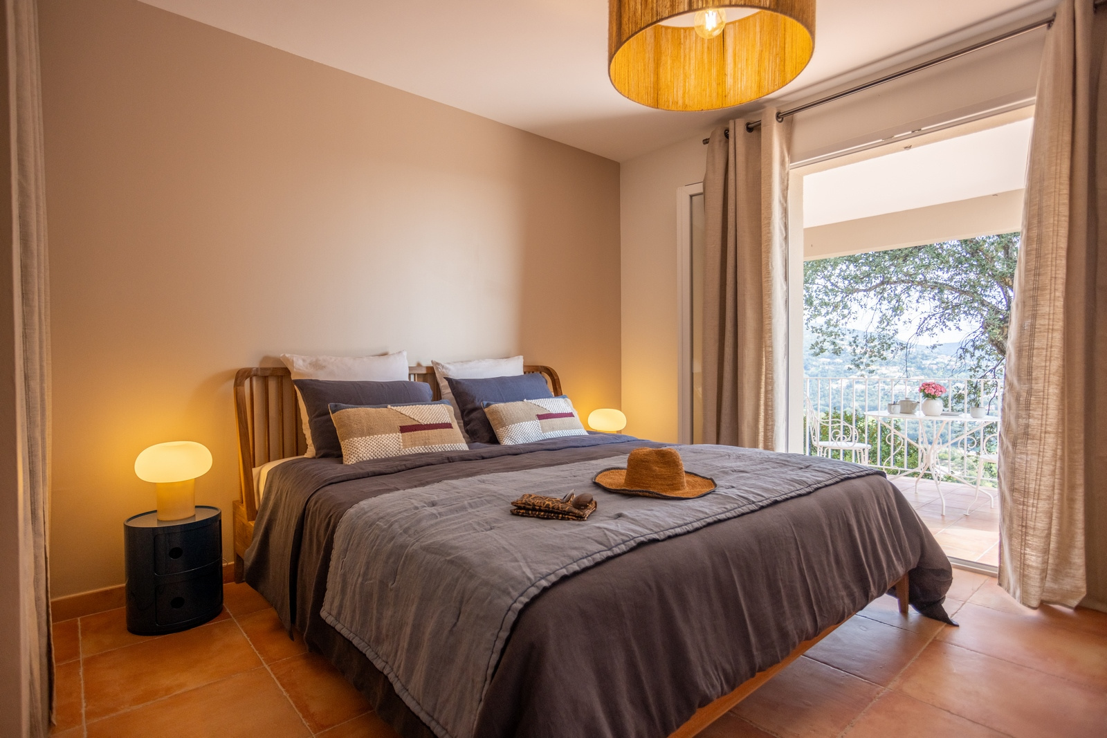 À l’étage, le charme opère de nouveau avec deux suites parentales, véritables havres de paix, bénéficiant d’un accès direct à une terrasse solarium. D’ici, la vue embrasse la mer et les collines dans une perspective à couper le souffle. Un lieu parfait pour contempler les couchers de soleil, verre à la main.