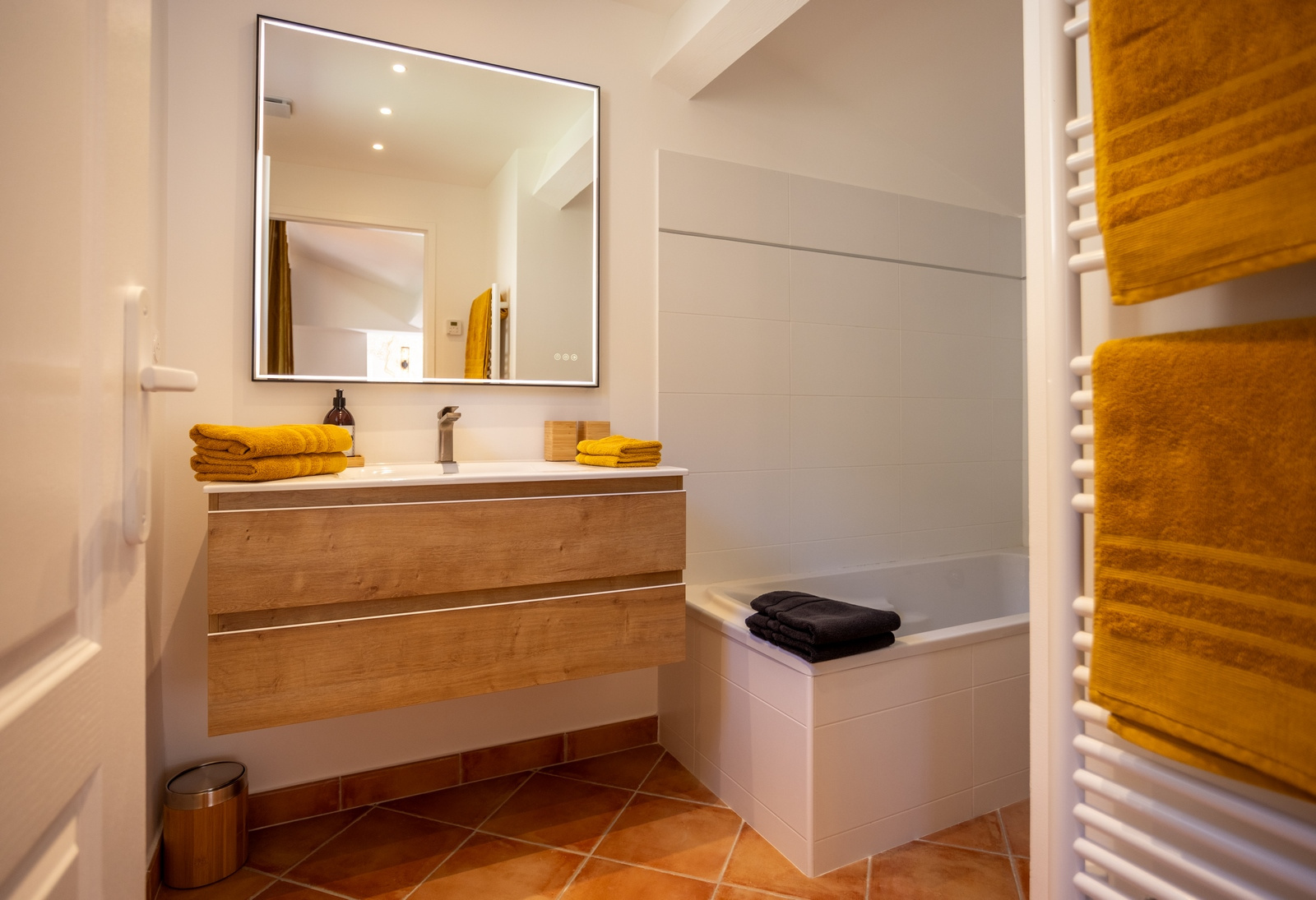 Un couloir mène à l’espace nuit, plus intime, où se dévoilent trois chambres en suite, chacune avec sa salle d’eau et ses WC, ouvrant sur une terrasse orientée à l’est, idéale pour savourer les premiers rayons du soleil. Une buanderie fonctionnelle et un WC invités complètent ce niveau.