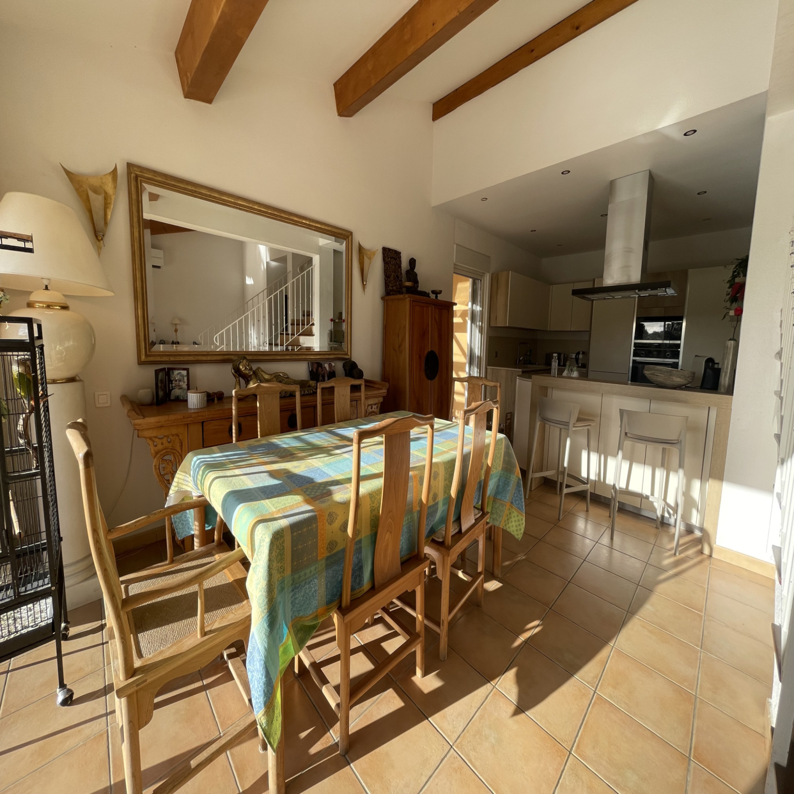 L'ensemble ouvrant sur de larges terrasses et la piscine chauffée & couverte. La villa dispose également d'un garage, d'un stationnement privatif, un jardin aménagé et planté en limite d'un espace vert, terrain de pétanque.