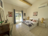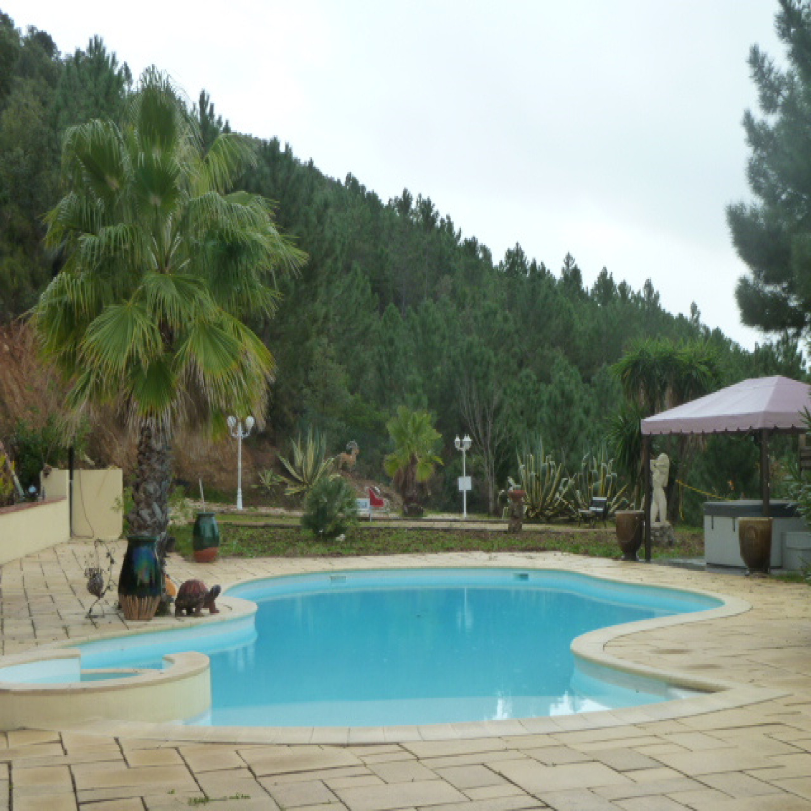 en Extérieur la grande piscine est entourée de terrasse, puis le terrain abrite un terrain de pétanque, une terrasse jacuzzi, des espaces plantés ...