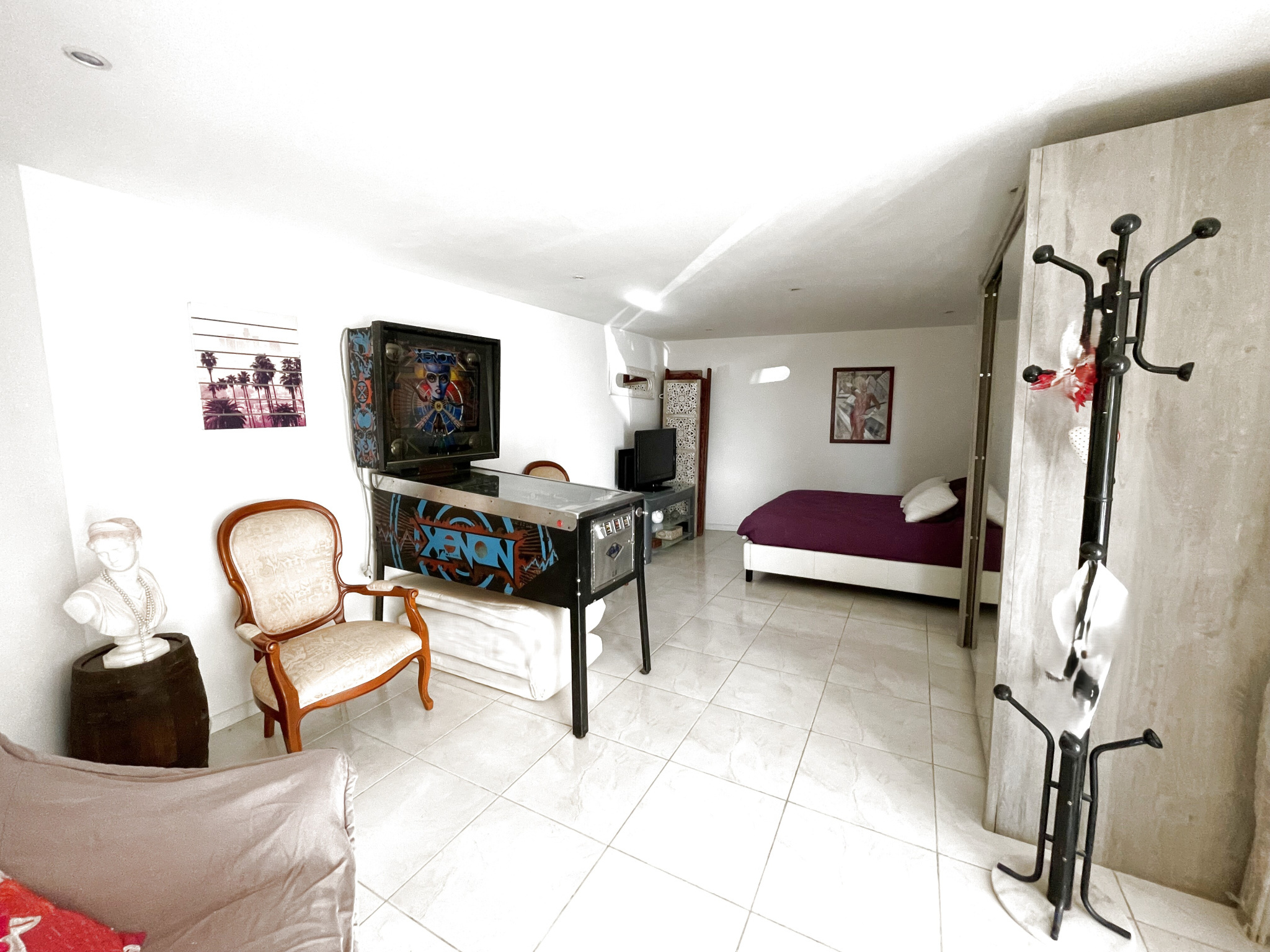 en sous-sol : un appartement de type 3, communiquant par un escalier intérieur (mais pouvant être indépendant), composé d'une salle à manger avec cuisine ouverte, une grande pièce, une chambre, avec salle de douche et WC; une buanderie, une garage et une cave.