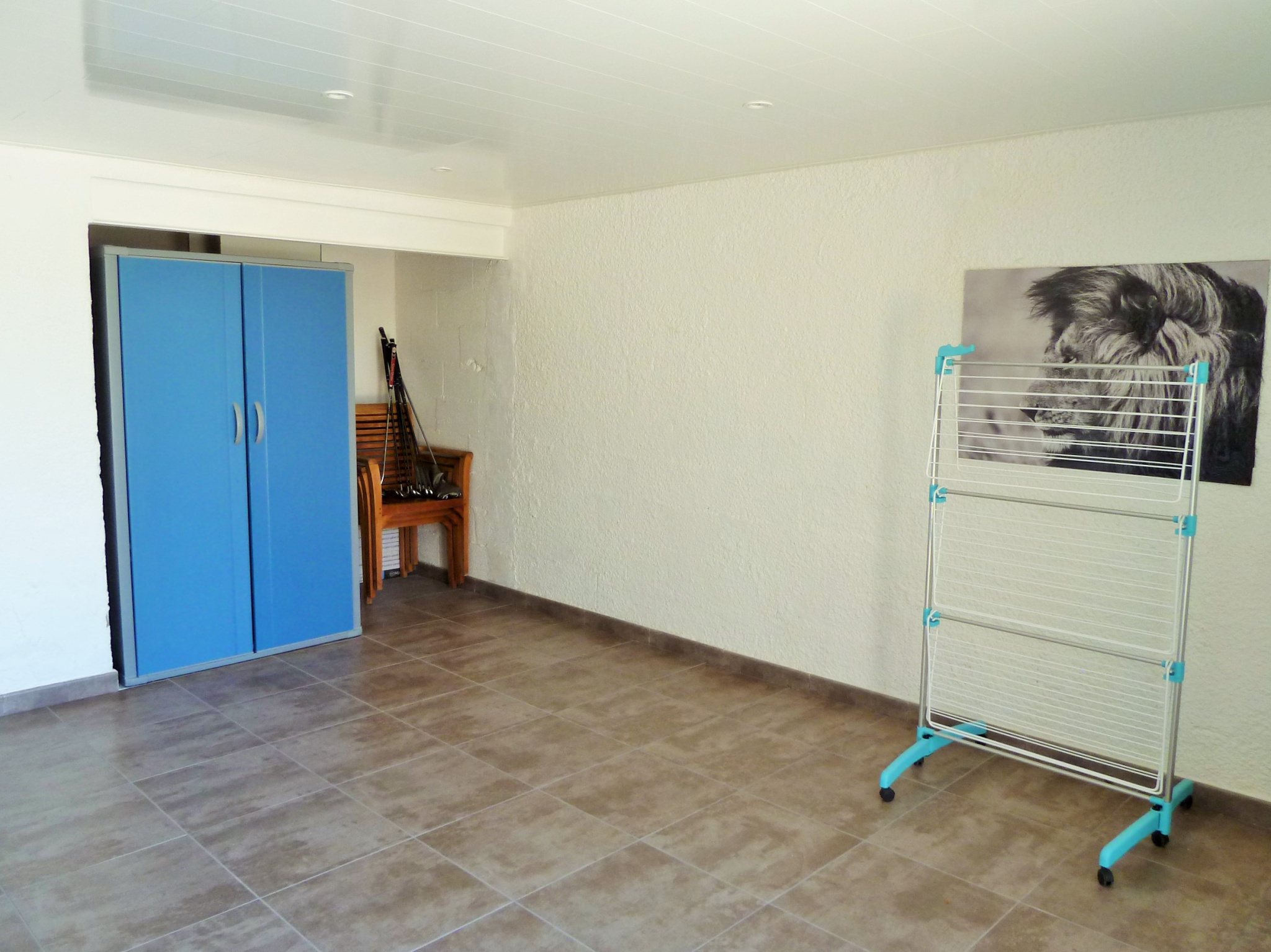 Le rez-de-jardin, quant à lui, dévoile des volumes généreux et modulables : une grande buanderie, une cave, une chambre d’appoint discrètement séparée par des portes coulissantes, ainsi qu’un garage carrelé ouvert sur le jardin, agrémenté d’un second poêle à pellets. Un atelier complète cet ensemble, idéal pour les amateurs de bricolage ou de création.